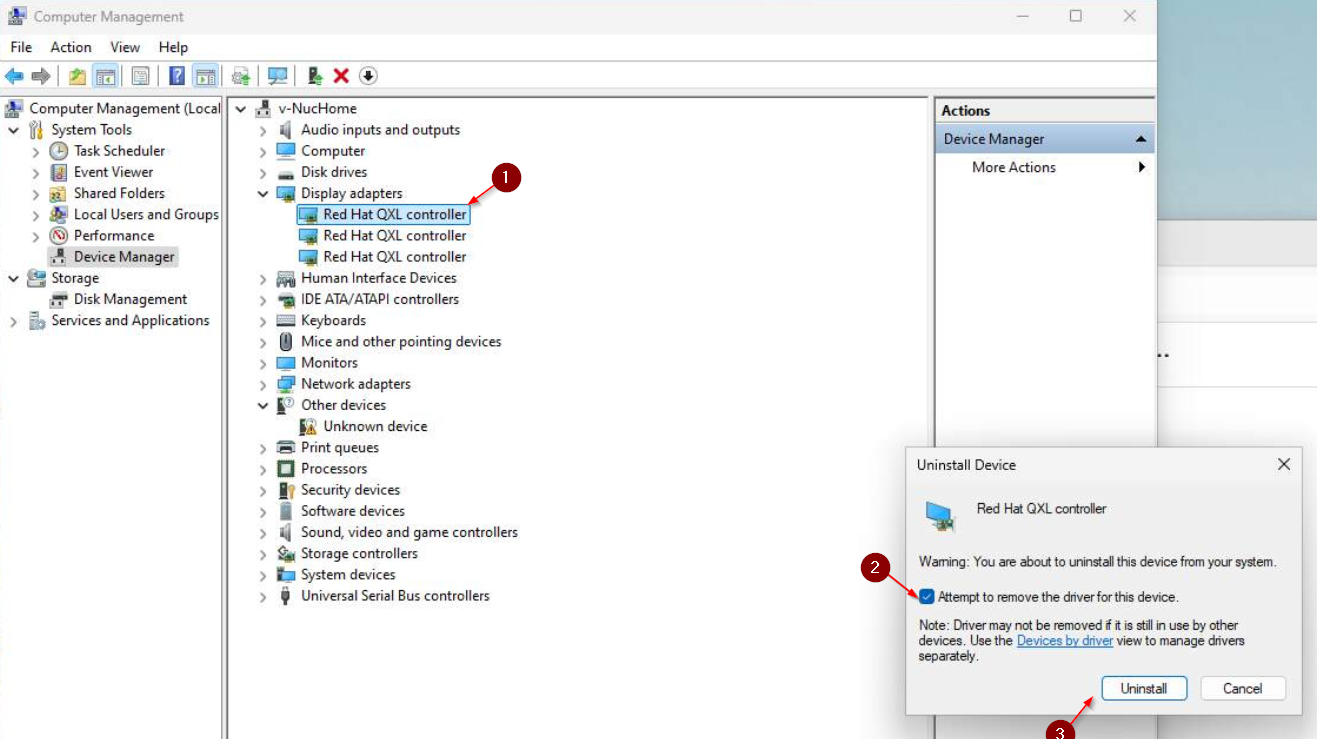 Dans la section Cartes graphiques, désinstallez le pilote QXL existant :