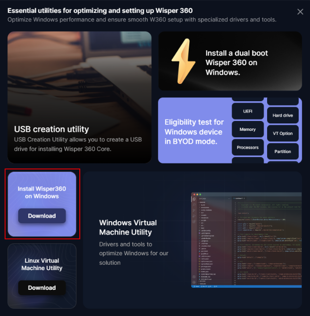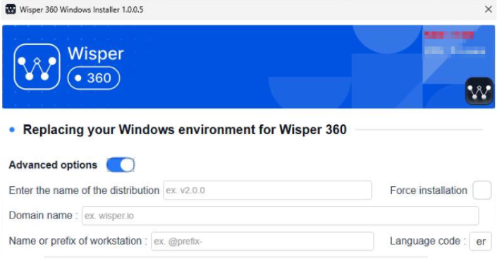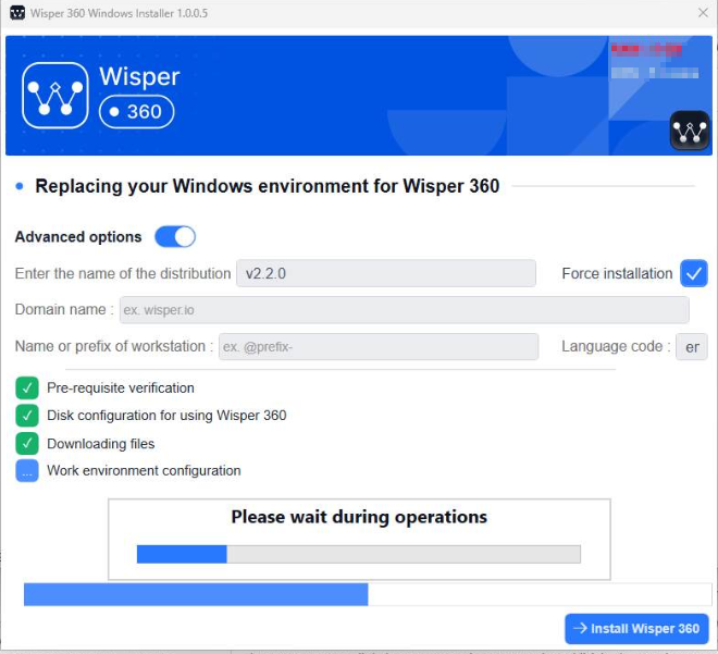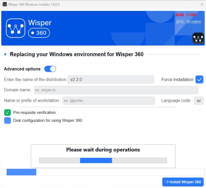Le Mode Windows Installation permet d’installer Wisper 360 Core en supprimant entièrement le système Windows existant. Il s’agit donc d’une réinstallation complète de l’environnement, à utiliser dans un contexte de déploiement maîtrisé.